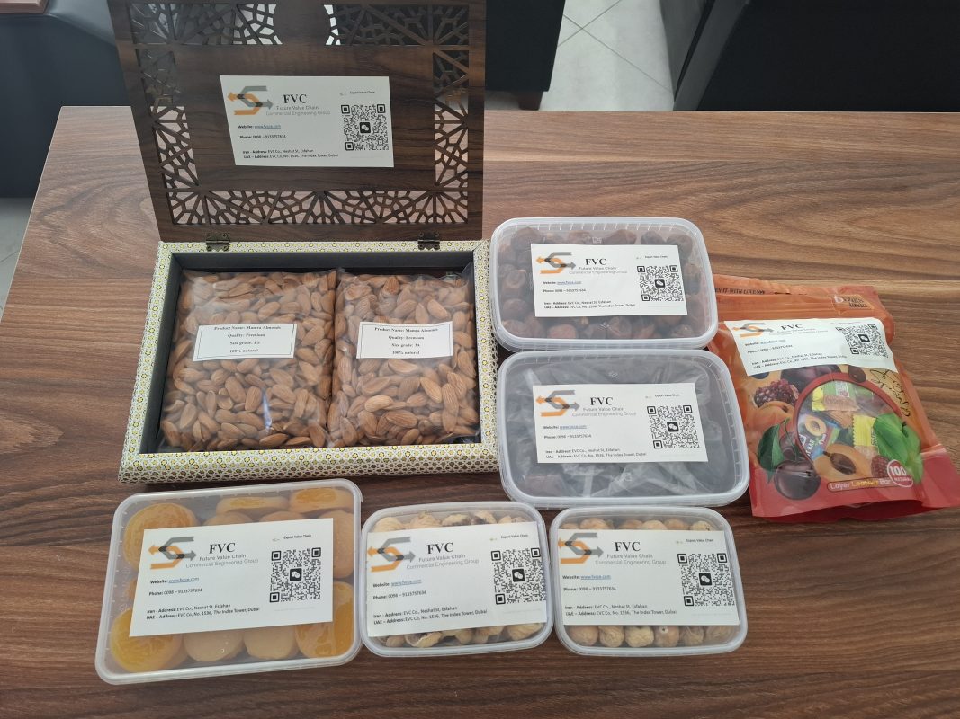 These images showcase a selection of sample dried fruits and nuts prepared and shipped by FVC (Future Value Chain) for one of our valued clients in China. The purpose of sending these samples is to evaluate the quality, packaging, and export standards of Iranian products before beginning large-scale cooperation.